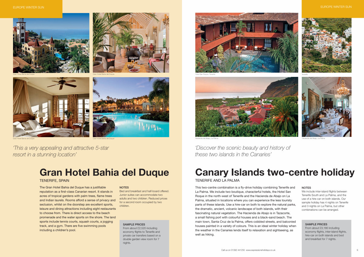 SAMPLE PRICES From about £ 2,520 including economy flights to Tenerife and private car transfers based on a double garden view room for 7 nights.