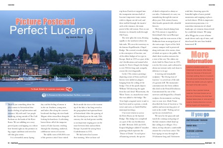 We tarry by the quay-side and watch the comings and goings of the lake steamers which head up lake calling in at villages. On a whim, we hop aboard a comfortable steamer for a two hour cruise. The boat zigzags its way through the 39 kilometre long and 3 kilometre wide lake, throwing open the beautiful sights of snow peaked mountains and stopping at places on both shores. With its impressive mountainous panorama, it is somewhat reminiscent of a fjord landscape, yet remains characterised by a mild lake climate. We jump off at Weggis for a taste of home made cheese and a sip of wine, and then board the next boat headed homeward. ■
