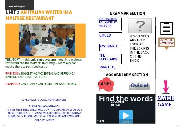 THE STORY : In this unit, some students meet in a maltese restaurant and the waiter is from Italy.....his family has moved there to run a business...