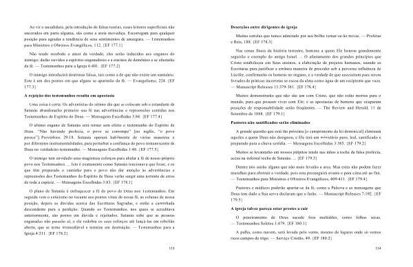 O inimigo tem envidado seus magistrais esforços para abalar a fé de nosso próprio povo nos Testemunhos . ... Isto é exatamente como Satanás tencionava que fosse , e os que têm preparado o caminho para o povo não dar atenção às advertências e repreensões dos Testemunhos do Espírito de Deus verão surgir uma torrente de erros de toda a espécie . — Mensagens Escolhidas 3:83 . { EF 178.1 }