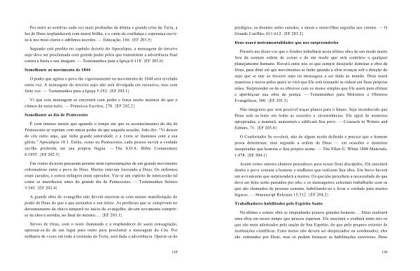 A grande obra do evangelho não deverá encerrar-se com menor manifestação do poder de Deus do que a que assinalou o seu início . As profecias que se cumpriram no derramamento da chuva temporã no início do evangelho , devem novamente cumprirse na chuva serôdia , no final do mesmo . ... { EF 203.1 }