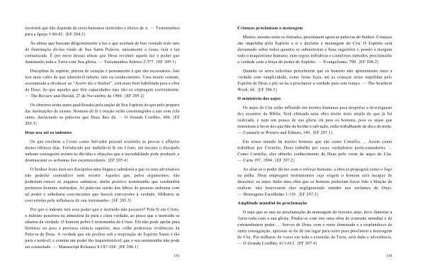 O anjo que se une na proclamação da mensagem do terceiro anjo , deve iluminar a Terra toda com a sua glória . Prediz-se com isto uma obra de extensão mundial e de extraordinário poder . ... Servos de Deus , com o rosto iluminado e a resplandecer de santa consagração , apressar-se-ão de um lugar para outro para proclamar a mensagem do Céu . Por milhares de vozes em toda a extensão da Terra , será dada a advertência . — O Grande Conflito , 611-612 . { EF 207.4 }