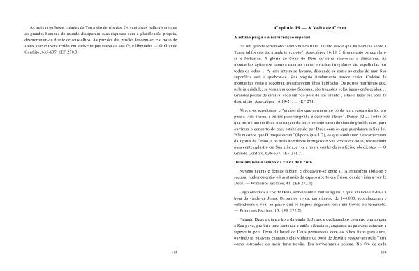 Há um grande terremoto “ como nunca tinha havido desde que há homens sobre a Terra ; tal foi este tão grande terremoto ”. Apocalipse 16:18 . O firmamento parece abrirse e fechar-se . A glória do trono de Deus dir-se-ia atravessar a atmosfera . As montanhas agitam-se como a cana ao vento , e rochas irregulares são espalhadas por todos os lados . ... A terra inteira se levanta , dilatando-se como as ondas do mar . Sua superfície está a quebrar-se . Seu próprio fundamento parece ceder . Cadeias de montanhas estão a soçobrar . Desaparecem ilhas habitadas . Os portos marítimos que , pela iniqüidade , se tornaram como Sodoma , são tragados pelas águas enfurecidas . ... Grandes pedras de saraiva , cada um “ do peso de um talento ”, estão a fazer sua obra de destruição . Apocalipse 16:19-21 . ... { EF 271.1 }