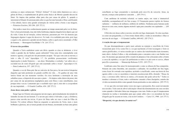 Com antífonas de melodia celestial , os santos anjos , em vasta e inumerável multidão , acompanham-nO em Seu avanço . O firmamento parece repleto de formas radiantes — milhares de milhares , milhões de milhões . Nenhuma pena humana pode descrever esta cena , mente alguma mortal é apta para conceber seu esplendor . ... { EF 274.2 }