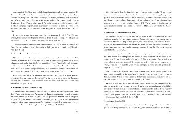 Ao surgirem os pequenos , imortais , de seu leito de pó , imediatamente seguirão caminho , voando , para os braços maternos . Reencontrar-se-ão , para nunca mais se separarem . Muitos dos pequeninos , porém , não terão mãe ali . Em vão nos pomos à escuta do arrebatador cântico de triunfo por parte da mãe . Os anjos acolherão os pequeninos sem mãe e os conduzirão para junto da árvore da vida . — Mensagens Escolhidas 2:260 . { EF 293.1 }