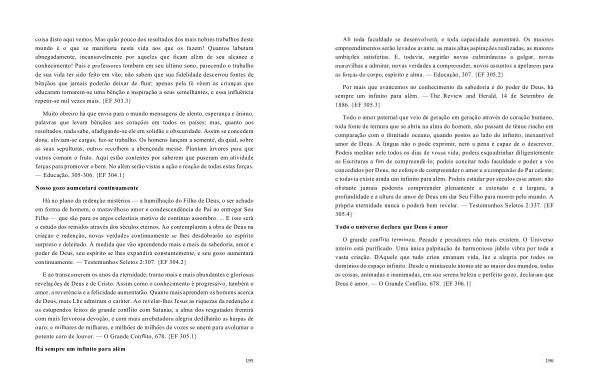 E ao transcorrerem os anos da eternidade , trarão mais e mais abundantes e gloriosas revelações de Deus e de Cristo . Assim como o conhecimento é progressivo , também o amor , a reverência e a felicidade aumentarão . Quanto mais aprendem os homens acerca de Deus , mais Lhe admiram o caráter . Ao revelar-lhes Jesus as riquezas da redenção e os estupendos feitos do grande conflito com Satanás , a alma dos resgatados fremirá com mais fervorosa devoção , e com mais arrebatadora alegria dedilharão as harpas de ouro ; e milhares de milhares , e milhões de milhões de vozes se unem para avolumar o potente coro de louvor . — O Grande Conflito , 678 . { EF 305.1 }