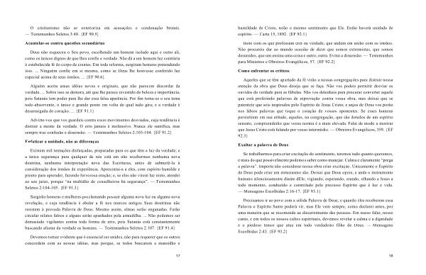 Insto com os que professam crer na verdade , que andem em união com os irmãos . Não procureis dar ao mundo ocasião de dizer que somos extremistas , que somos desunidos , que um ensina uma coisa e outro , outra . Evitai a dissensão . — Testemunhos para Ministros e Obreiros Evangélicos , 57 . { EF 92.2 }
