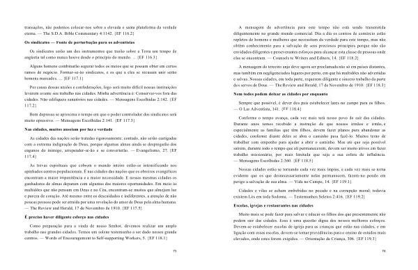 Conforme o tempo avança , cada vez mais terá nosso povo de sair das cidades . Durante anos temos recebido a instrução de que nossos irmãos e irmãs , e especialmente as famílias que têm filhos , devem fazer planos para abandonar as cidades , conforme diante deles se abra o caminho para fazê-lo . Muitos terão de trabalhar com empenho para ajudar a abrir o caminho . Mas até que seja possível saírem , durante todo o tempo que ali permanecerem , devem ser muito ativos em fazer trabalho missionário , por mais limitada que seja a sua esfera de influência . — Mensagens Escolhidas 2:360 . { EF 118.5 }