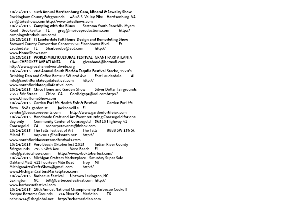 10/24/2015Garden For Life Health Fair & FestivalGarden For Life Farm8581 garden stjacksonvilleFLvendor@beaucoreevents.comhttp://www.gardenforlifejax.com