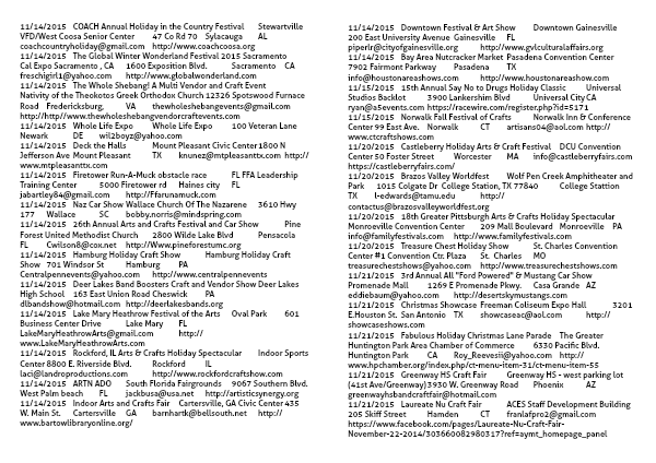 11/14/2015Rockford, IL Arts & Crafts Holiday SpectacularIndoor Sports Center8800 E. Riverside Blvd.RockfordILlaci@landroproductions.comhttp://www.rockfordcraftshow.com