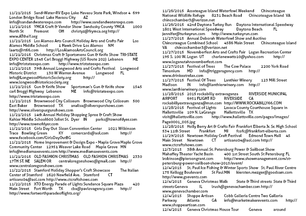 11/29/2015Newtown Holiday Craft FestivalEdmond Town Hall45 Main StreetNewtownCTartisans04@aol.comhttp://www.ctcraftshows.com