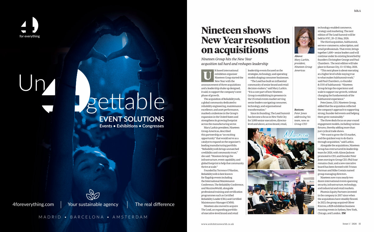 U exhibition organiser Nineteen Goup started the New Year with the announcement of three acquisitions and a leadership shake up designed, it said, to support the company’ s next phase of growth.