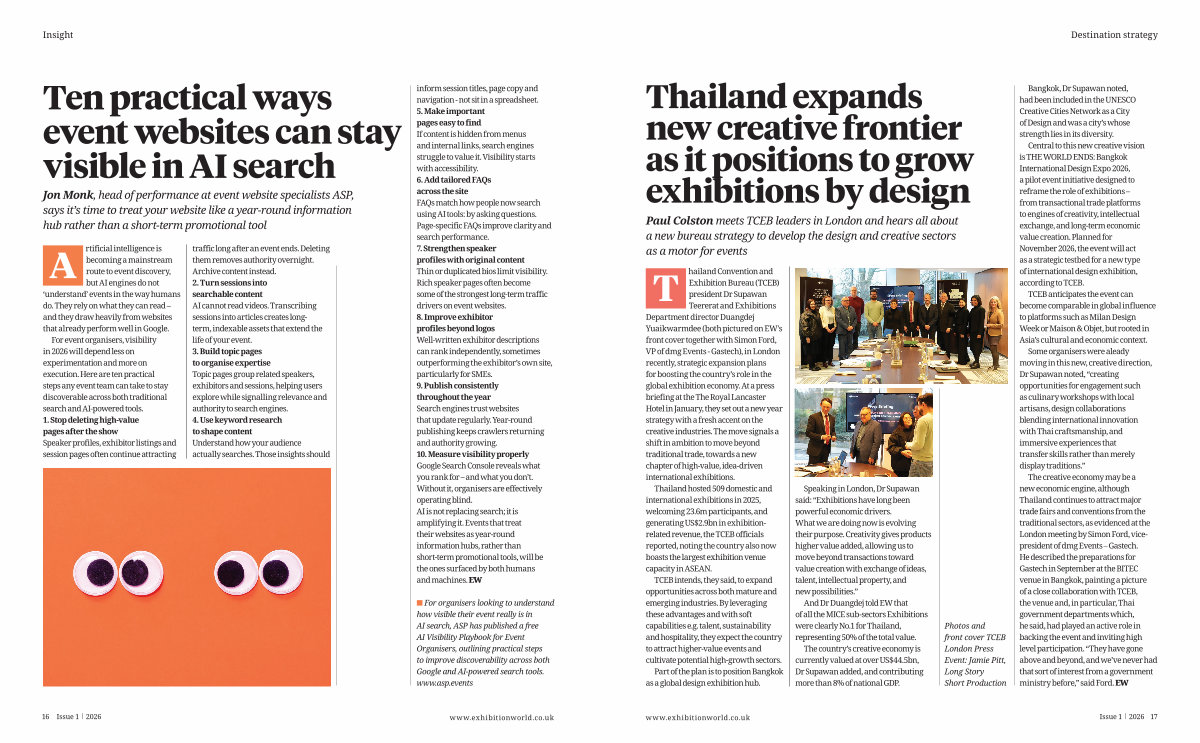 The creative economy may be a new economic engine, although Thailand continues to attract major trade fairs and conventions from the traditional sectors, as evidenced at the London meeting by Simon Ford, vicepresident of dmg Events – Gastech. He described the preparations for Gastech in September at the BITEC venue in Bangkok, painting a picture of a close collaboration with TCEB, the venue and, in particular, Thai government departments which, he said, had played an active role in backing the event and inviting high level participation.“ They have gone above and beyond, and we’ ve never had that sort of interest from a government ministry before,” said Ford. EW www. exhibitionworld. co. uk Issue 1 2026 17