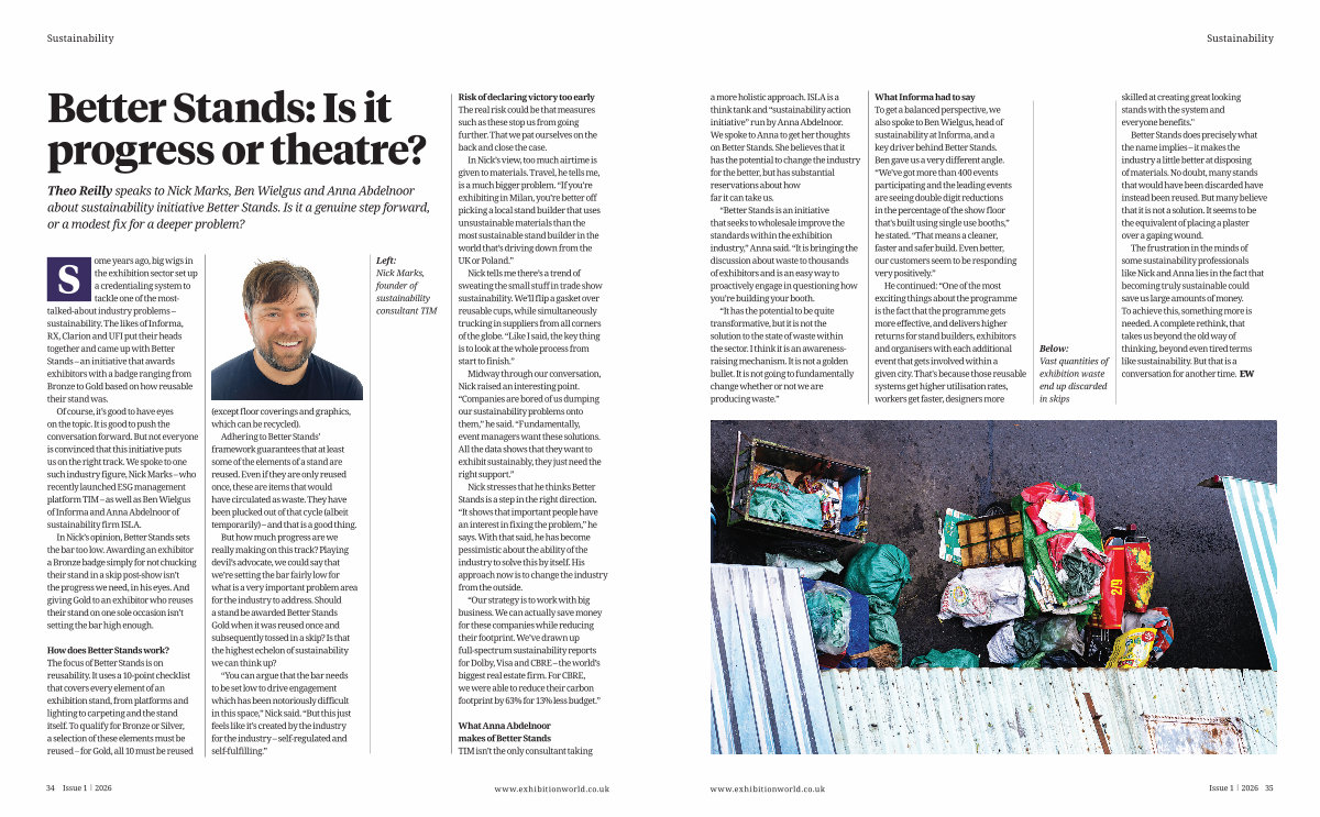 What Informa had to say To get a balanced perspective, we also spoke to Ben Wielgus, head of sustainability at Informa, and a key driver behind Better Stands. Ben gave us a very different angle.“ We ' ve got more than 400 events participating and the leading events are seeing double digit reductions in the percentage of the show floor that ' s built using single use booths,” he stated.“ That means a cleaner, faster and safer build. Even better, our customers seem to be responding very positively.”