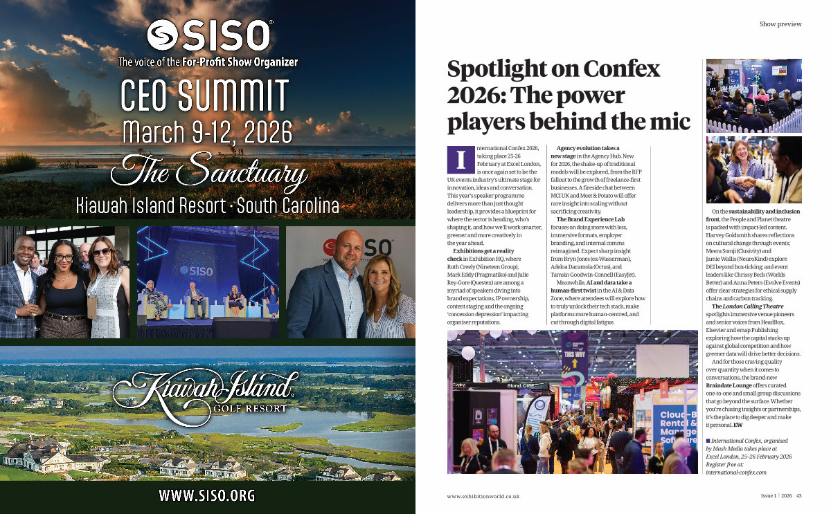 n International Confex, organised by Mash Media takes place at Excel London, 25 – 26 February 2026 Register free at: international-confex. com www. exhibitionworld. co. uk Issue 1 2026 43