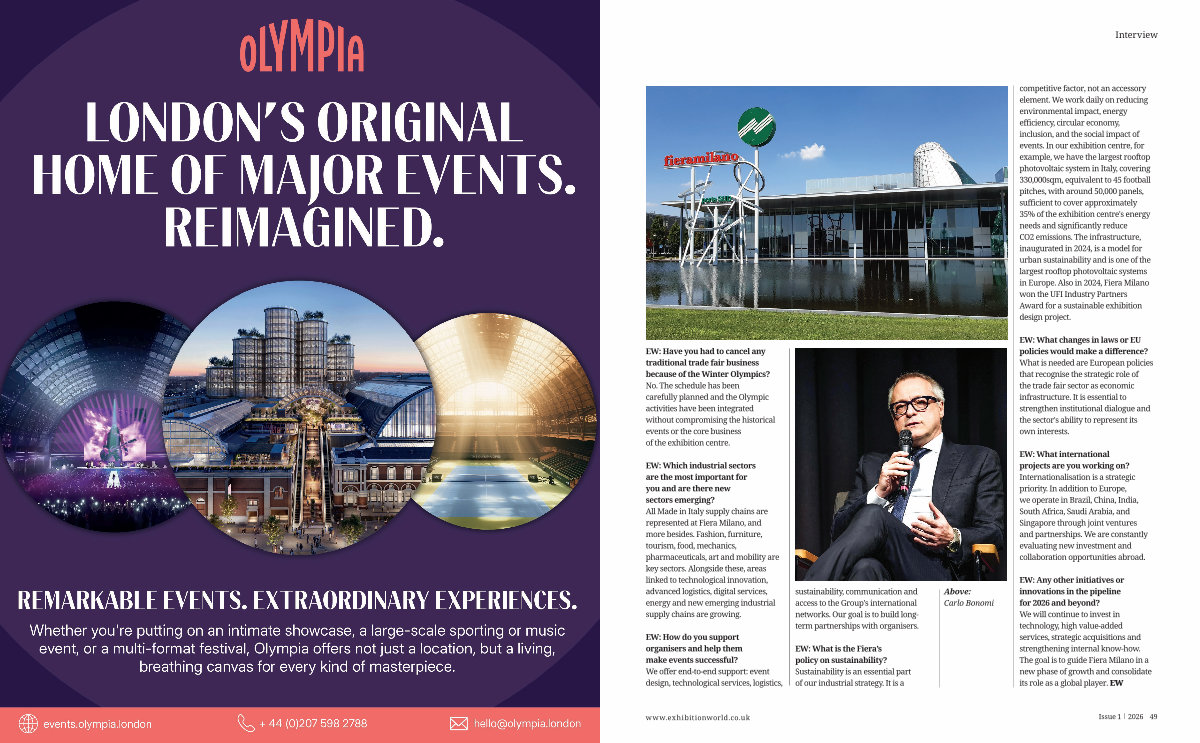 EW: Any other initiatives or innovations in the pipeline for 2026 and beyond? We will continue to invest in technology, high value-added services, strategic acquisitions and strengthening internal know-how. The goal is to guide Fiera Milano in a new phase of growth and consolidate its role as a global player. EW www. exhibitionworld. co. uk Issue 1 2026 49