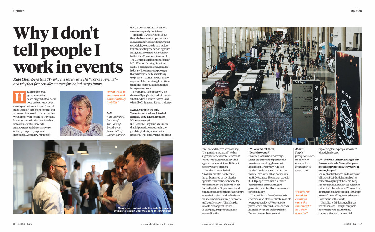 EW: You ran Clarion Gaming as MD for over a decade. Surely if anyone should be proud to say they work in events, it’ s you? You’ re absolutely right, and I am proud of it, now. But I think for much of my career I was guilty of the same thing I’ m describing. I led with the outcomes rather than the industry. ICE grew from a struggling show of around 12,000sqm to one of the world’ s great trade events. I was proud of that work.