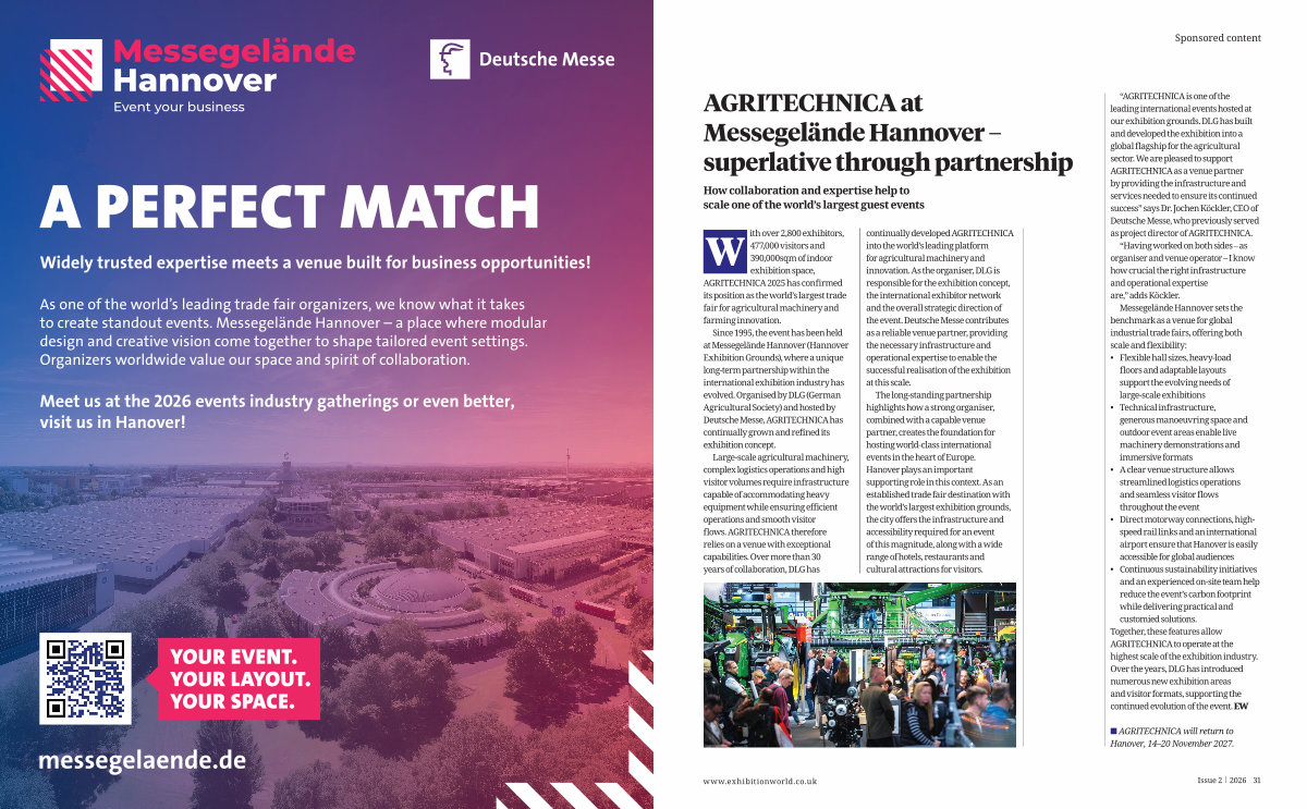 n AGRITECHNICA will return to Hanover, 14 – 20 November 2027. www. exhibitionworld. co. uk Issue 2 2026 31