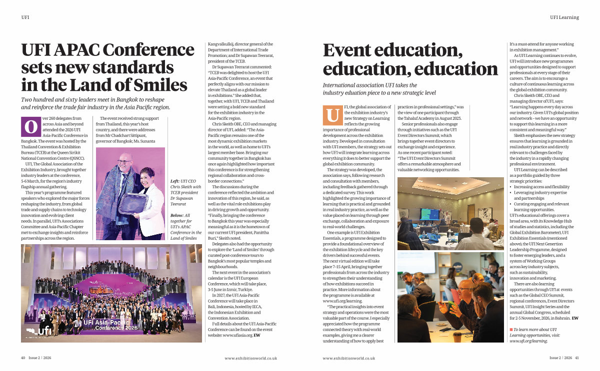 Chris Skeith OBE, CEO and managing director of UFI, added:“ The Asia- Pacific region remains one of the most dynamic exhibition markets in the world, as well as home to UFI’ s largest member base. Bringing our community together in Bangkok has once again highlighted how important this conference is for strengthening regional collaboration and crossborder connections.”
