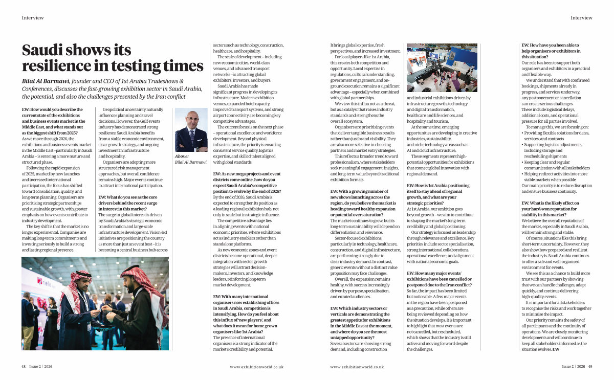 Bilal Al Barmawi, founder and CEO of 1st Arabia Tradeshows & Conferences, discusses the fast-growing exhibition sector in Saudi Arabia, the potential, and also the challenges presented by the Iran conflict