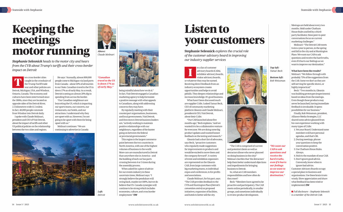 When asked for a piece of advice for our events industry in these uncertain times, Molinari says:“ I strongly believe the pendulum will swing back, maybe not 100 %, but we do believe that US- Canada synergies will continue to be strong which includes economies, culture, and cross border employment.” EW