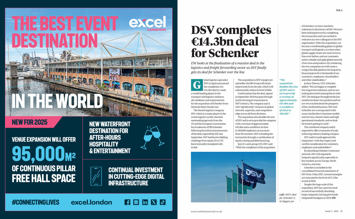 Despite the huge scale of this acquisition, DSV has a proven track record of successfully absorbing large companies, having previously integrated Panalpina in 2019. EW www. exhibitionworld. co. uk Issue 3 2025 23