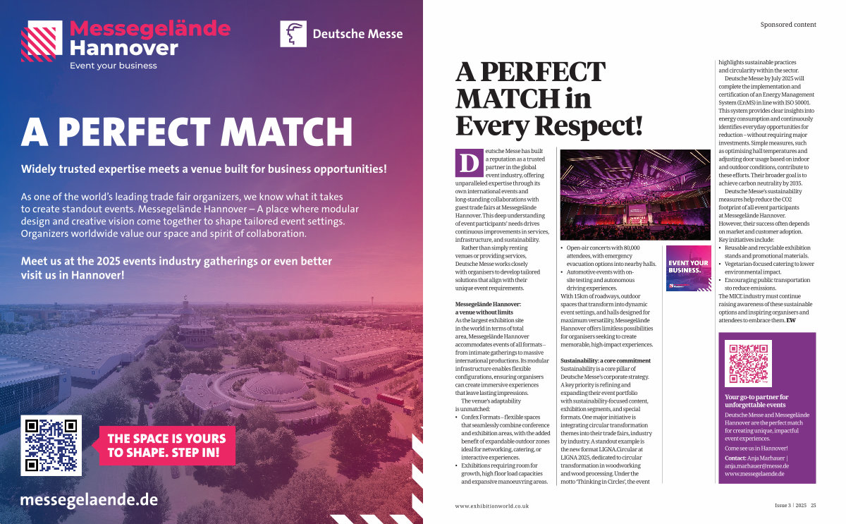 Deutsche Messe and Messegelände Hannover are the perfect match for creating unique, impactful event experiences. Come see us in Hannover! Contact: Anja Marhauer | anja. marhauer @ messe. de www. messegelaende. de www. exhibitionworld. co. uk Issue 3 2025 25