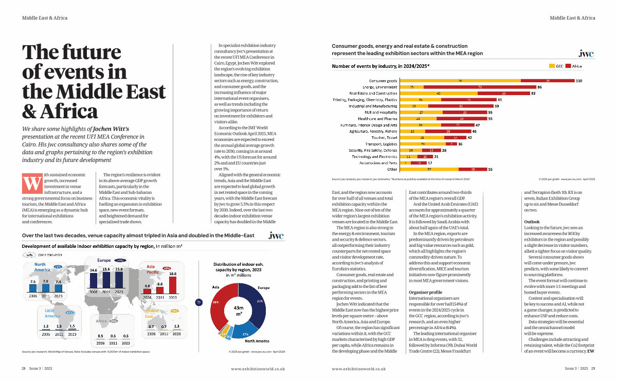 The MEA region is also strong in the energy & environment, tourism and security & defence sectors, all outperforming their industry counterparts for net rented space and visitor development rate, according to jwc’ s analysis of Eurofairs statistics.