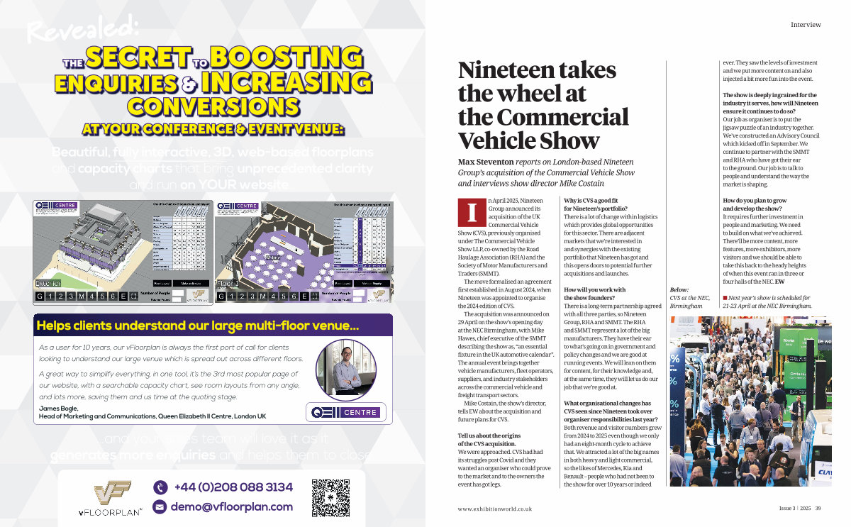 What organisational changes has CVS seen since Nineteen took over organiser responsibilities last year? Both revenue and visitor numbers grew from 2024 to 2025 even though we only had an eight-month cycle to achieve that. We attracted a lot of the big names in both heavy and light commercial, so the likes of Mercedes, Kia and Renault – people who had not been to the show for over 10 years or indeed
