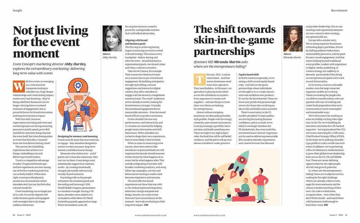 So, where are the entrepreneurs hiding? Some are in adjacent sectors, waiting for the right challenge. Others are already within events, eager for more autonomy and the chance to build something of their own. Our role is to find them, recognise them – even when they don’ t fit the mould – and match them with businesses bold enough to back their vision. EW www. exhibitionworld. co. uk Issue 3 2025 41
