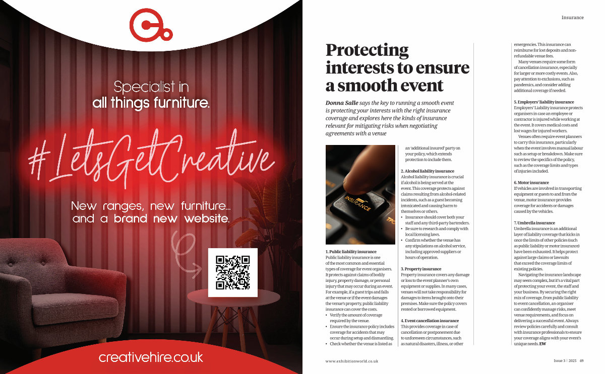 Navigating the insurance landscape may seem complex, but it ' s a vital part of protecting your event, the staff and your business. By securing the right mix of coverage, from public liability to event cancellation, an organiser can confidently manage risks, meet venue requirements, and focus on delivering a successful event. Always review policies carefully and consult with insurance professionals to ensure your coverage aligns with your event’ s unique needs. EW www. exhibitionworld. co. uk Issue 3 2025 49