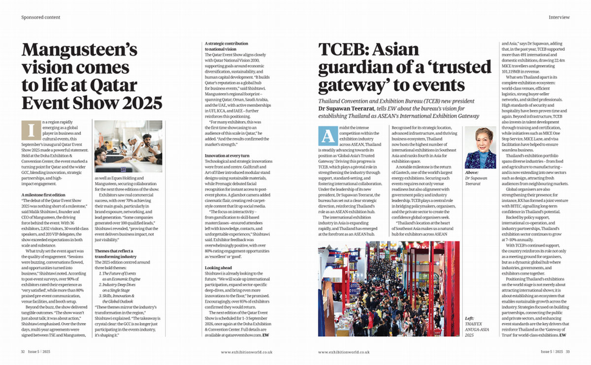 Positioning Thailand’ s exhibitions on the world stage is not merely about attracting international shows; it is about establishing an ecosystem that enables sustainable growth across the industry. Strategies focused on building partnerships, connecting the public and private sectors, and enhancing event standards are the key drivers that reinforce Thailand as the‘ Gateway of Trust’ for world-class exhibitions. EW www. exhibitionworld. co. uk Issue 5 2025 33