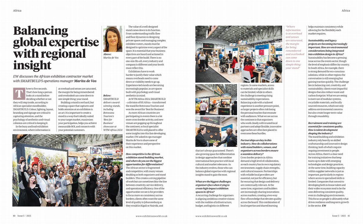 Recruitment and training are essential for consistent quality. How is talent development shaping the industry? The stand-building and exhibition industry rely heavily on skilled craftsmanship and innovative design thinking, both of which require ongoing investment in people. Across Africa, there’ s a clear need for training initiatives that keep teams up to date with emerging technologies and design practices. At the same time, building capacity within supplier networks is just as important, particularly in regions where access to specialised skills is limited. Companies that commit to developing both in-house talent and their wider ecosystem tend to be the ones delivering consistent quality, even in challenging environments. This focus on people is ultimately what drives resilience and long-term growth in the sector. EW