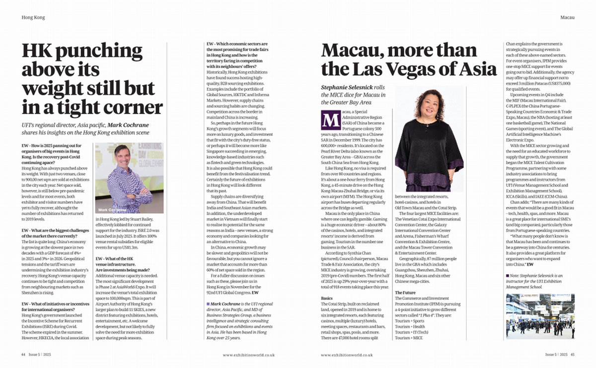 EW – What are the biggest challenges of the market there currently? The list is quite long. China’ s economy is growing at the slowest pace in two decades with a GDP forecast of 4 %+ in 2025 and 3 %+ in 2026. Geopolitical tensions and the tariff wars are undermining the exhibition industry’ s recovery. Hong Kong’ s venue capacity continues to be tight and competition from neighbouring markets such as Shenzhen is rising.