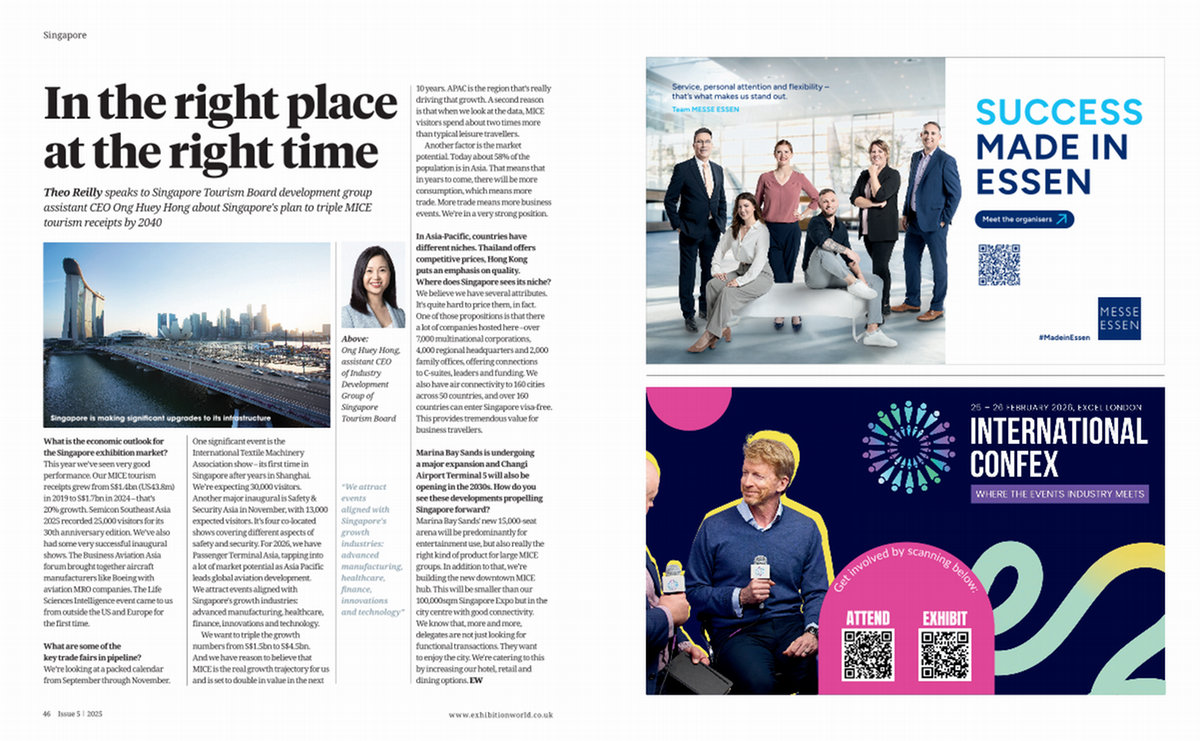 One significant event is the International Textile Machinery Association show – its first time in Singapore after years in Shanghai. We’ re expecting 30,000 visitors. Another major inaugural is Safety & Security Asia in November, with 13,000 expected visitors. It’ s four co-located shows covering different aspects of safety and security. For 2026, we have Passenger Terminal Asia, tapping into a lot of market potential as Asia Pacific leads global aviation development. We attract events aligned with Singapore ' s growth industries: advanced manufacturing, healthcare, finance, innovations and technology.