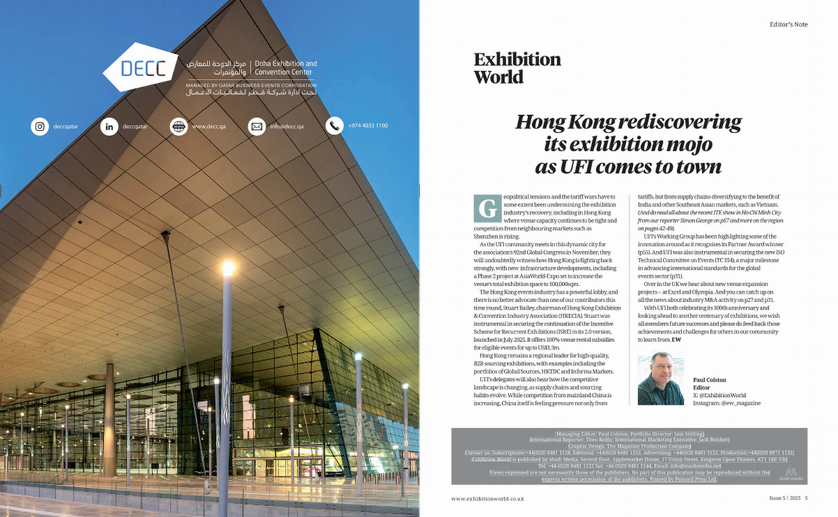 The Hong Kong events industry has a powerful lobby, and there is no better advocate than one of our contributors this time round, Stuart Bailey, chairman of Hong Kong Exhibition & Convention Industry Association( HKECIA). Stuart was instrumental in securing the continuation of the Incentive Scheme for Recurrent Exhibitions( ISRE) in its 2.0 version, launched in July 2025. It offers 100 % venue rental subsidies for eligible events for up to US $ 1.3m.
