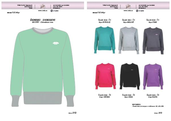 - Ženski duks je dostupan u veličinama: M, L, XL, XXL