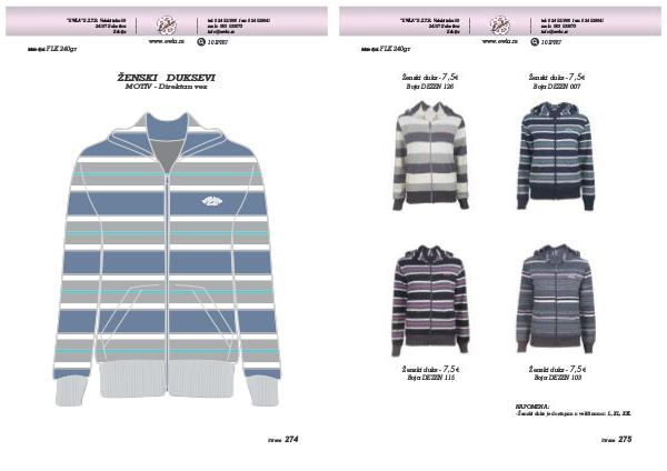 ”EWLA” S.Z.T.R. Velebitska 59 24107 Subotica Srbija tel: 024 521866 fax: 024 529041 mob: 063 533073 info@ewla.rs www.ewla.rs Materijal: FLK 101PRU 240gr ŽENSKI DUKSEVI MOTIV - Direktan vez Strana 274