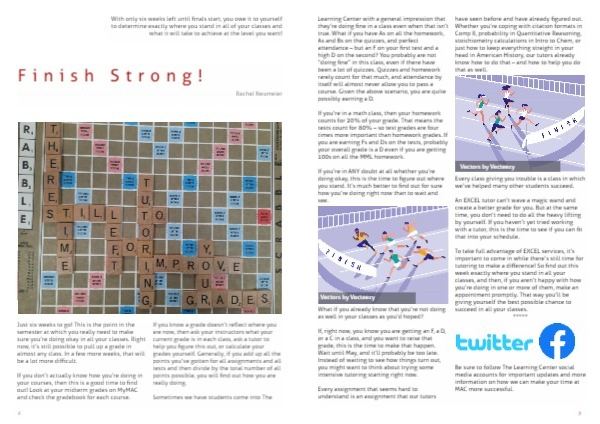 To take full advantage of EXCEL services, it’s important to come in while there’s still time for tutoring to make a difference! So find out this week exactly where you stand in all your classes, and then, if you aren’t happy with how you’re doing in one or more of them, make an appointment promptly. That way you’ll be giving yourself the best possible chance to succeed in all your classes.