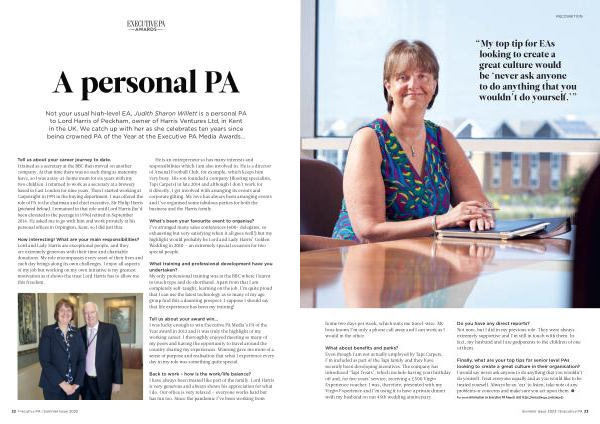 Not your usual high-level EA , Judith Sharon Willett is a personal PA to Lord Harris of Peckham , owner of Harris Ventures Ltd , in Kent in the UK . We catch up with her as she celebrates ten years since being crowned PA of the Year at the Executive PA Media Awards …