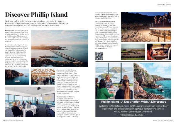 Your Business Meeting Destination Breathe life into your next corporate event by bringing your team together on Phillip Island . Only 90 minutes from Melbourne , Phillip Island has all the elements conference event organisers look for when planning an event . If you ’ re planning a conference , executive retreat , team building weekend or product launch , Phillip Island is a destination with a difference . At first glance , your guests will be blown away by the island ’ s