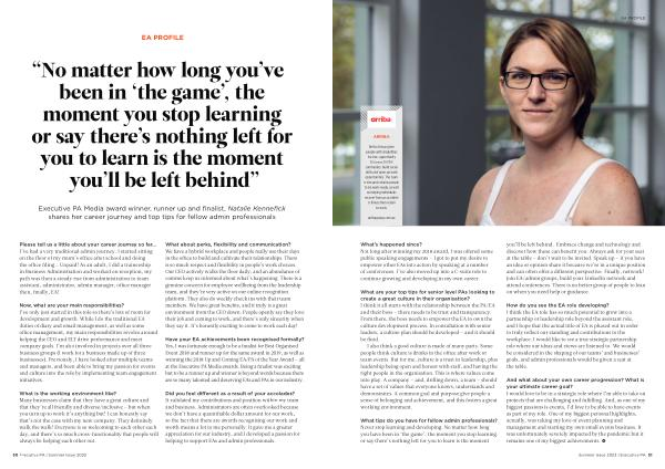 What tips do you have for fellow admin professionals ? Never stop learning and developing . No matter how long you have been in ‘ the game ’, the moment you stop learning or say there ’ s nothing left for you to learn is the moment you ’ ll be left behind . Embrace change and technology and discover how these can benefit you . Always ask for your seat at the table – don ’ t wait to be invited . Speak up – if you have an idea or opinion share it because we ’ re in a unique position and can often offer a different perspective . Finally , network ! Join EA / admin groups , build your LinkedIn network and attend conferences . There is no better group of people to lean on when you need help or guidance .