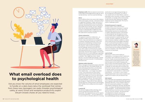 Stress As you will know this is a key issue in the workplace with several negative outcomes . And email overload is a significant contributor . A large-scale survey of academic and administrative staff at an Australian university showed staff who receive work email on their mobile devices said that , because colleagues know they are always accessible , the perceived pressure to respond quickly is heightened . Staff consider it stressful to leave a message alone when the sender knows it has been received .