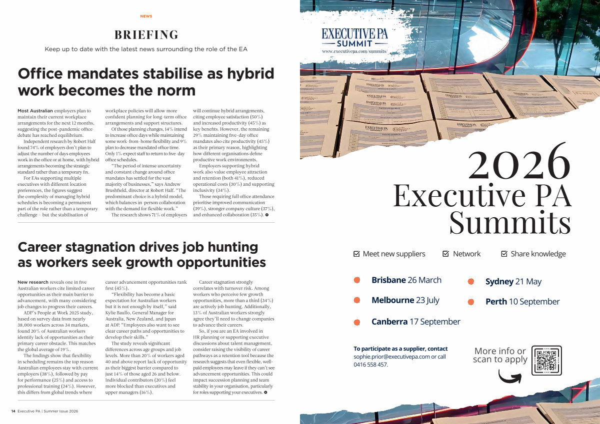 So, if you are an EA involved in HR planning or supporting executive discussions about talent management, consider raising the visibility of career pathways as a retention tool because the research suggests that even flexible, wellpaid employees may leave if they can’ t see advancement opportunities. This could impact succession planning and team stability in your organisation, particularly for roles supporting your executives. S
