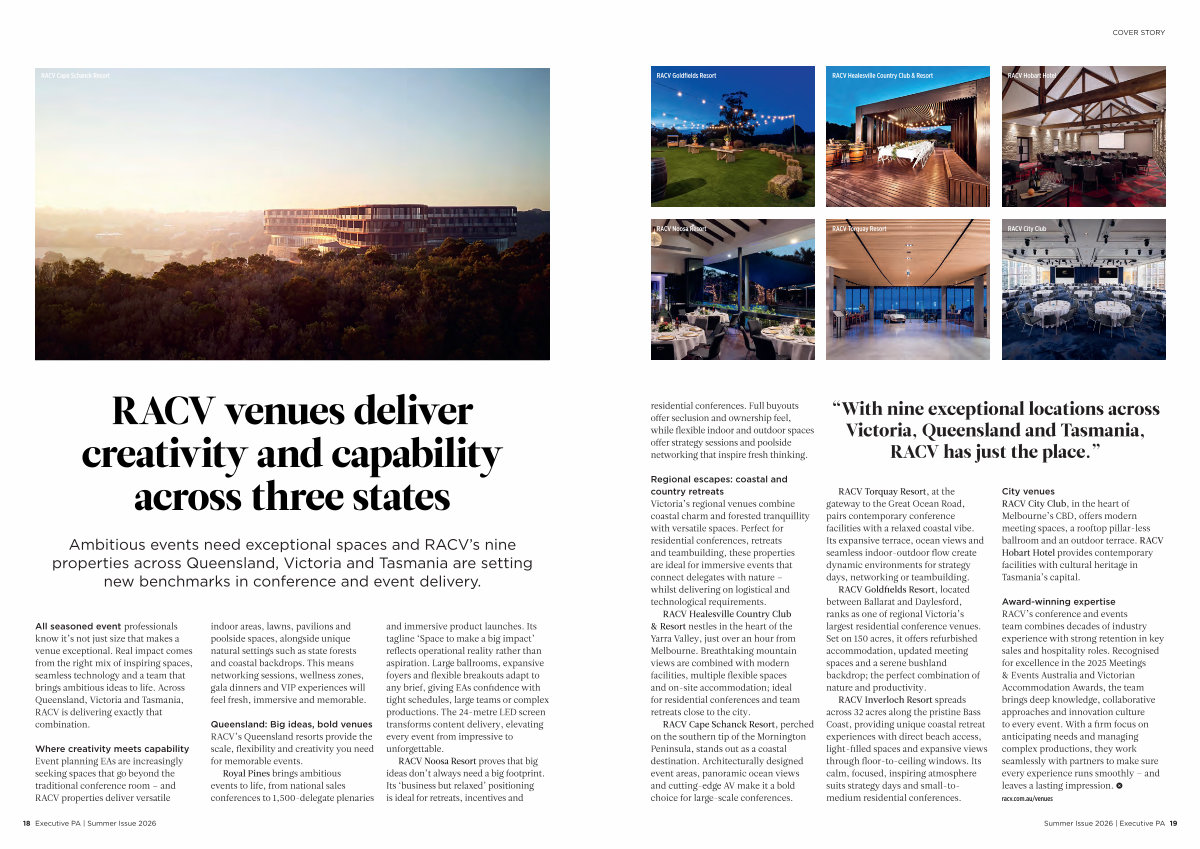Where creativity meets capability Event planning EAs are increasingly seeking spaces that go beyond the traditional conference room – and RACV properties deliver versatile indoor areas, lawns, pavilions and poolside spaces, alongside unique natural settings such as state forests and coastal backdrops. This means networking sessions, wellness zones, gala dinners and VIP experiences will feel fresh, immersive and memorable.