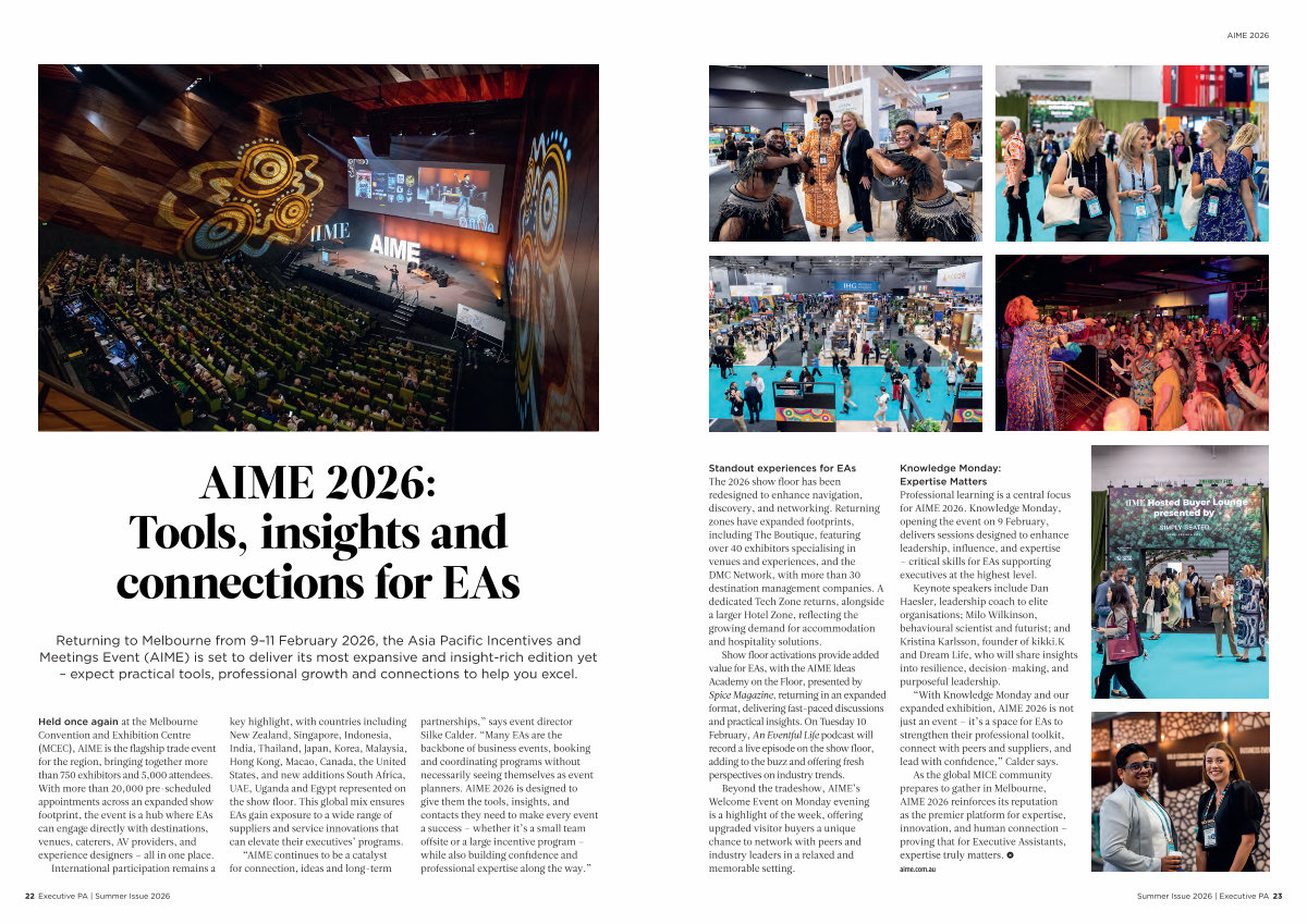 International participation remains a key highlight, with countries including New Zealand, Singapore, Indonesia, India, Thailand, Japan, Korea, Malaysia, Hong Kong, Macao, Canada, the United States, and new additions South Africa, UAE, Uganda and Egypt represented on the show floor. This global mix ensures EAs gain exposure to a wide range of suppliers and service innovations that can elevate their executives’ programs.“ AIME continues to be a catalyst for connection, ideas and long-term partnerships,” says event director Silke Calder.“ Many EAs are the backbone of business events, booking and coordinating programs without necessarily seeing themselves as event planners. AIME 2026 is designed to give them the tools, insights, and contacts they need to make every event a success – whether it’ s a small team offsite or a large incentive program – while also building confidence and professional expertise along the way.”
