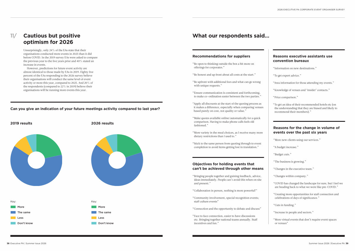 However, predictions for future event activity are almost identical to those made by EAs in 2019. Eighty five percent of the EAs responding to the 2026 survey believe their organisations will conduct the same level of event activity or more this year, compared to 2025. And 20 % of the respondents( compared to 22 % in 2019) believe their organisations will be running more events this year.
