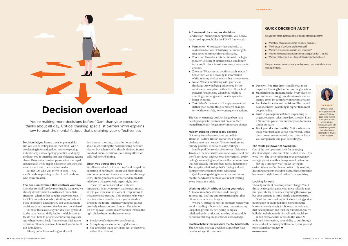 Good decision-making isn’ t about having perfect information or unlimited time. Sometimes the bravest choice is simply to choose, take action on that next right step and trust the foundation you’ ve built through thousands of small, solid decisions. When everyone has access to the same AI tools and information, your ability to cut through noise and act decisively will become your greatest professional advantage. S bethanwinn. com. au