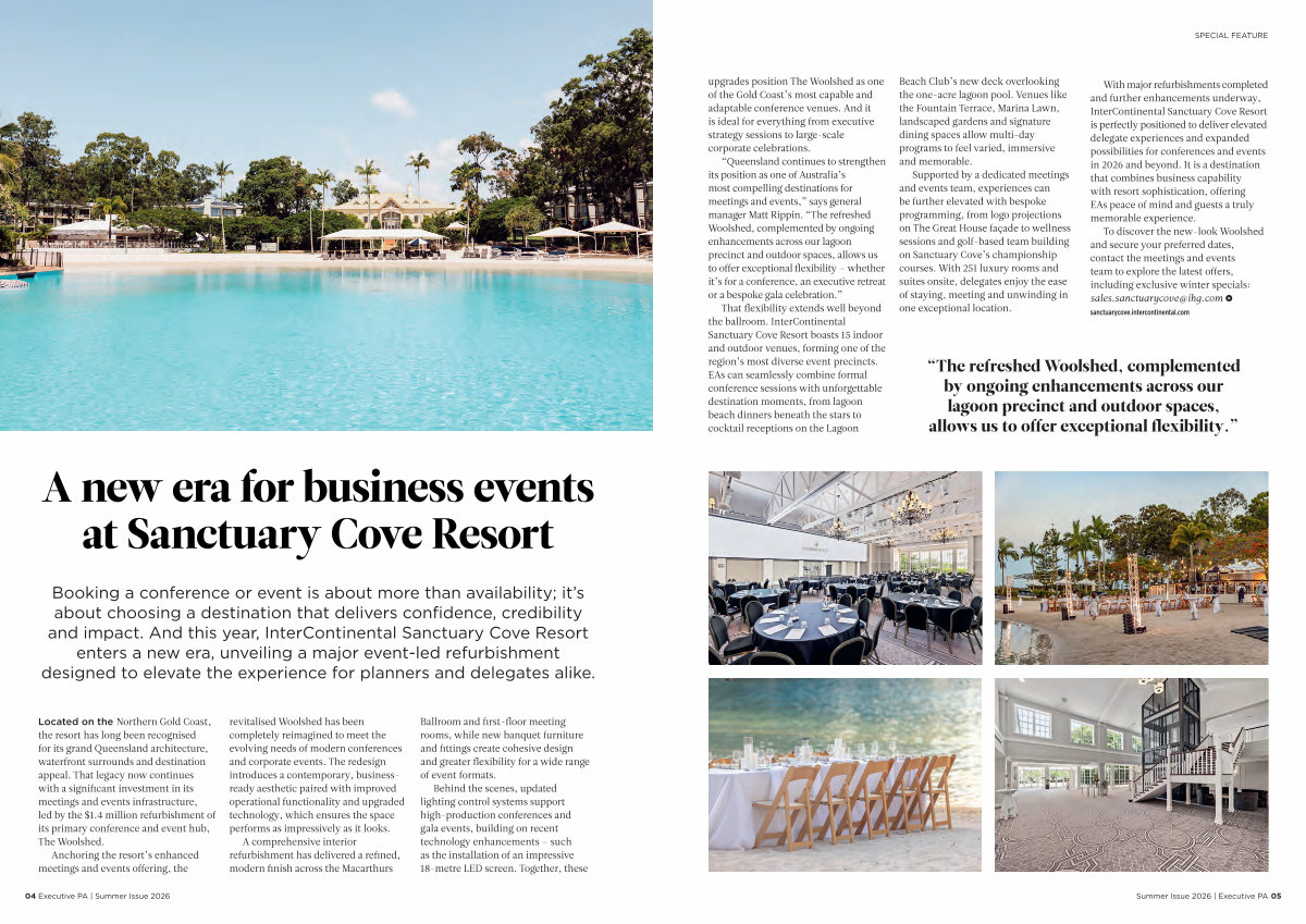 With major refurbishments completed and further enhancements underway, InterContinental Sanctuary Cove Resort is perfectly positioned to deliver elevated delegate experiences and expanded possibilities for conferences and events in 2026 and beyond. It is a destination that combines business capability with resort sophistication, offering EAs peace of mind and guests a truly memorable experience.