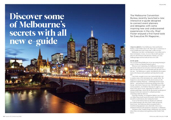 The Melbourne Convention Bureau recently launched a new interactive e-guide designed to connect event planners and delegates with some inspiring new and undiscovered experiences in the city . Brad Foster enjoyed a first-hand taste for Executive PA Magazine …